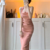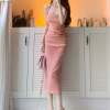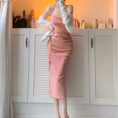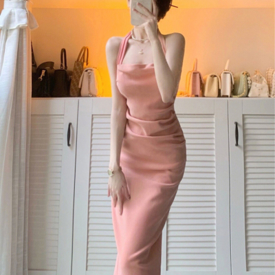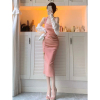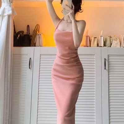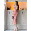 纯欲粉色挂脖吊带连衣裙女夏质感高级感法式收腰包臀中长裙子气质